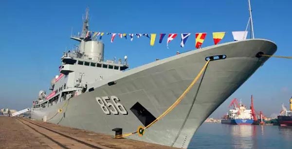 入列命名仪式现场开阳星船,舷号856,是中国自行研发的新一代电子侦察船,能够对一定范围内各种目标实施全天候、不间断侦察,掌握其部署動向。