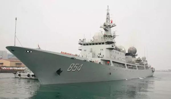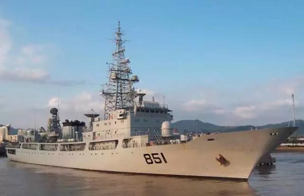 855电子侦察船,沪东造船厂建造,2014年7月28日下水,2015年8月1日服役。能接收并记录无线电通信、雷达和武器控制系统等电子设备所发射的电磁波信号,对一定范围内各种目标实施全天候、不间断侦察,掌握其部署动向。