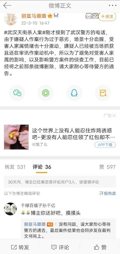 在案发初期在微博曝光此事并呼吁外界关注的跨性别博主“丽兹马璐璐”也删除了早先曝光此事的微博,自称是因为接到了武汉警方的电话,“由于嫌疑人作案行为过于恶劣,场景十分血腥,嫌疑人已经被当场抓获且还在审讯作案动机中,所以为了避免对受害人家属的影响,以及影响警方案件的侦查工作,目前已经将之前那条微博删除,请大家耐心等待警方的通告。”丽兹马璐璐还在该微博评论区表示,“请耐心等待警方通告,最后案件结果也会同步发在裁判文书网上。”
