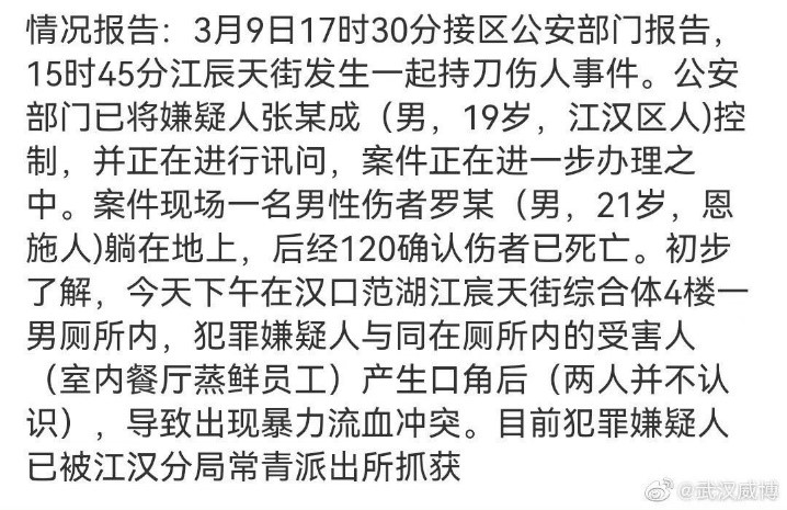 【博闻社武汉报道】武汉市中心大型购物中心“江宸天街”3月9日发生了一起针对跨性别者的杀人案。死者为一名跨性别女性,于当日下午按照其生理性别在男厕如厕时遭一男子扒下衣物并持刀杀害。