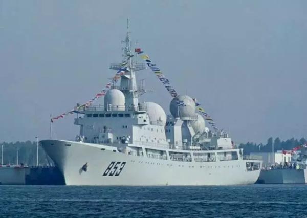 855电子侦察船,沪东造船厂建造,2014年7月28日下水,2015年8月1日服役。能接收并记录无线电通信、雷达和武器控制系统等电子设备所发射的电磁波信号,对一定范围内各种目标实施全天候、不间断侦察,掌握其部署动向。