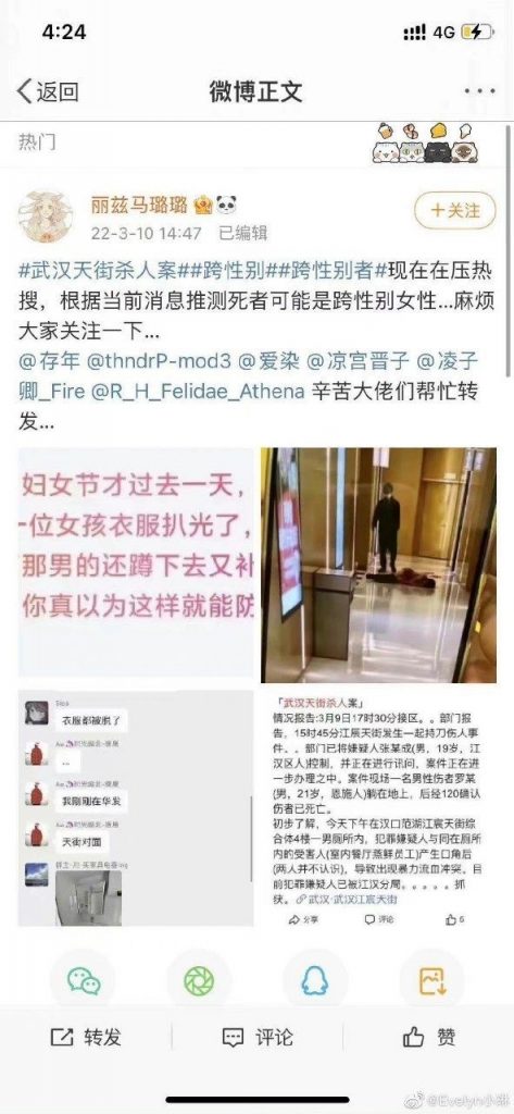 【博闻社武汉报道】武汉市中心大型购物中心“江宸天街”3月9日发生了一起针对跨性别者的杀人案。死者为一名跨性别女性,于当日下午按照其生理性别在男厕如厕时遭一男子扒下衣物并持刀杀害。